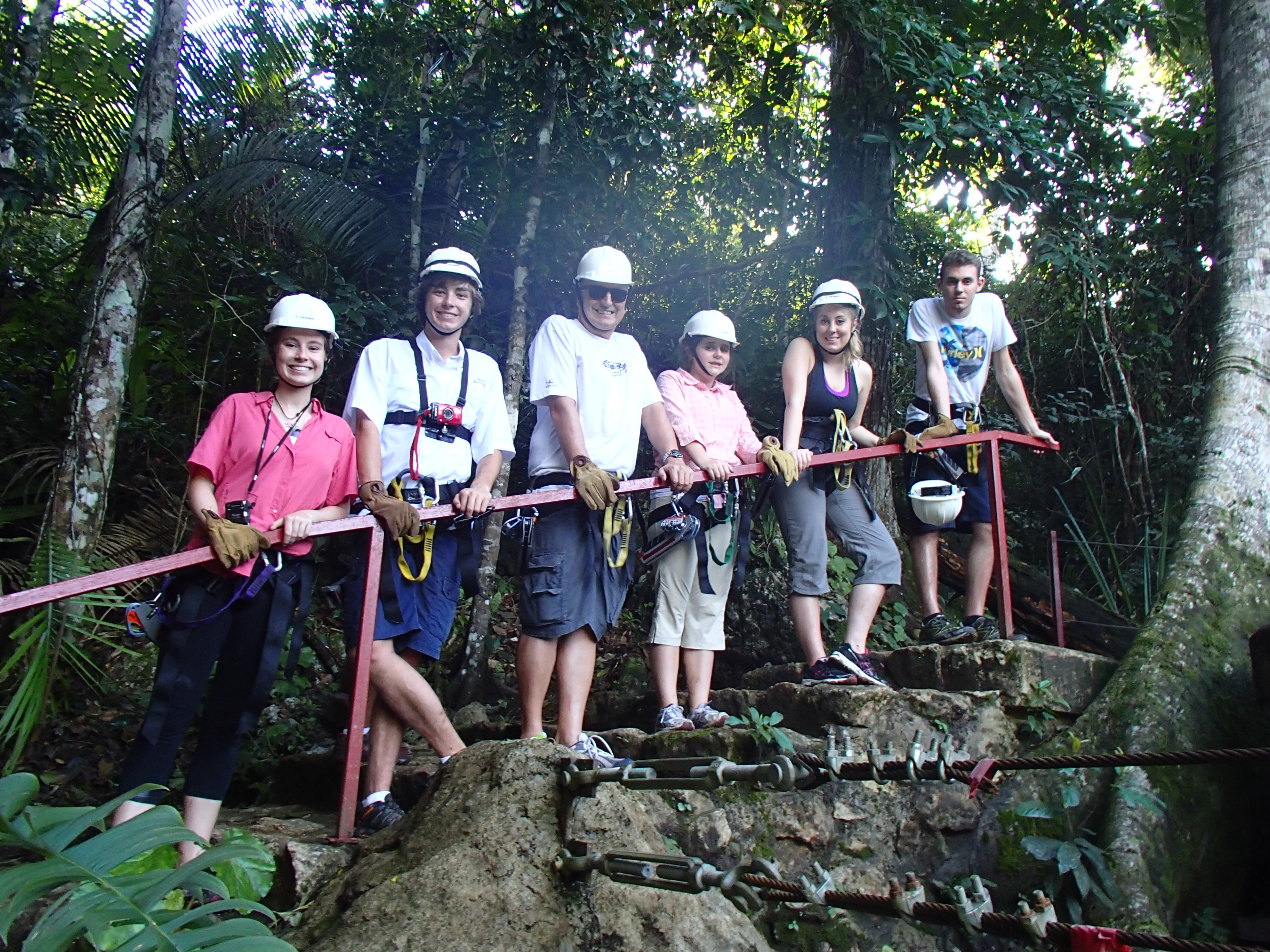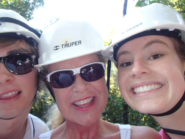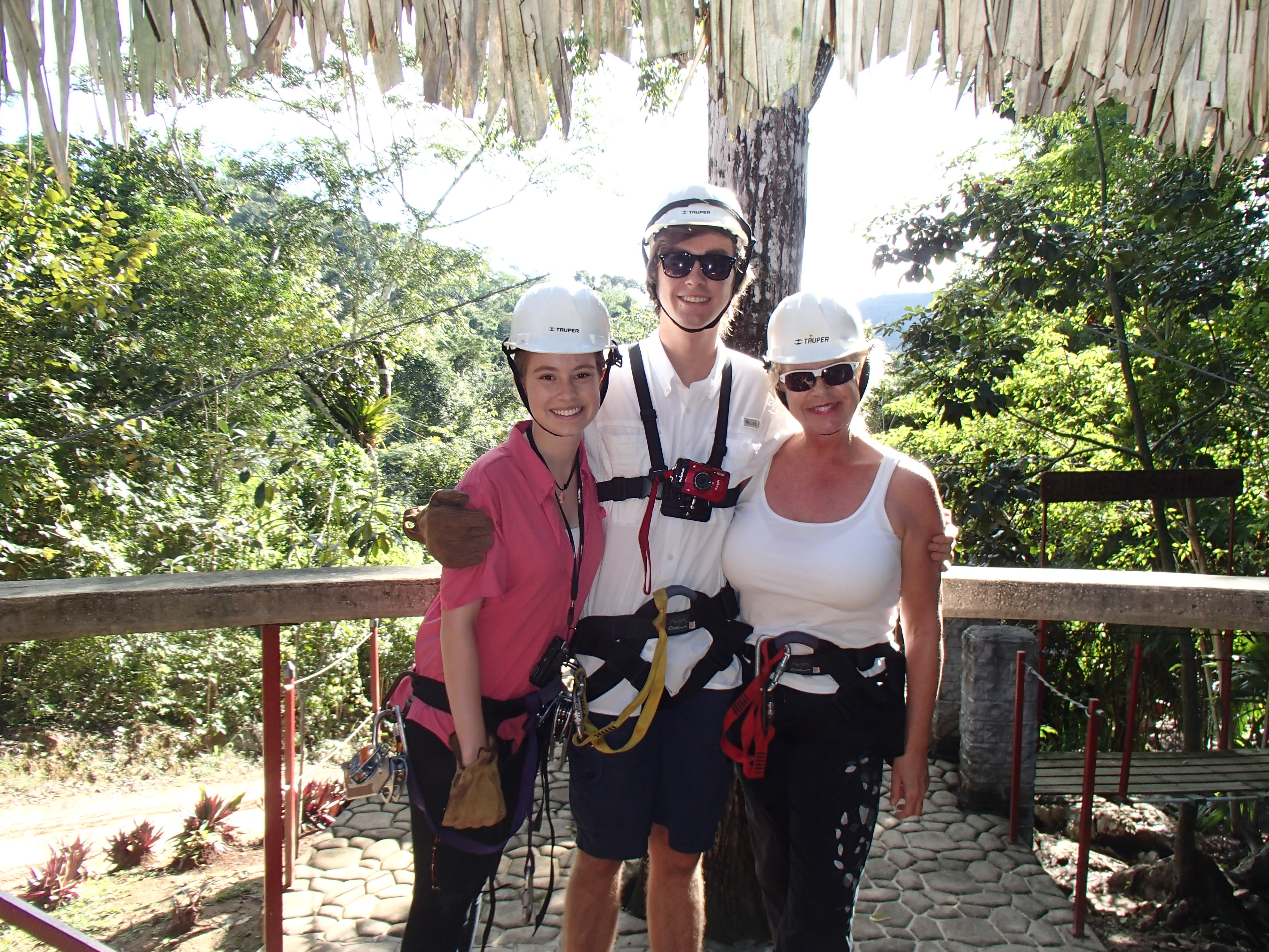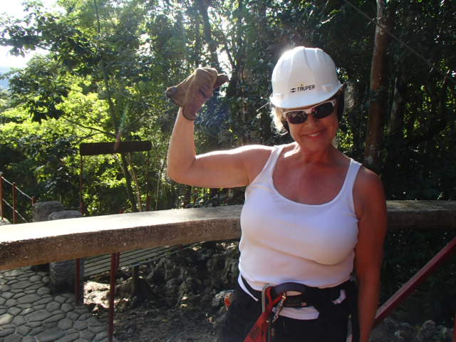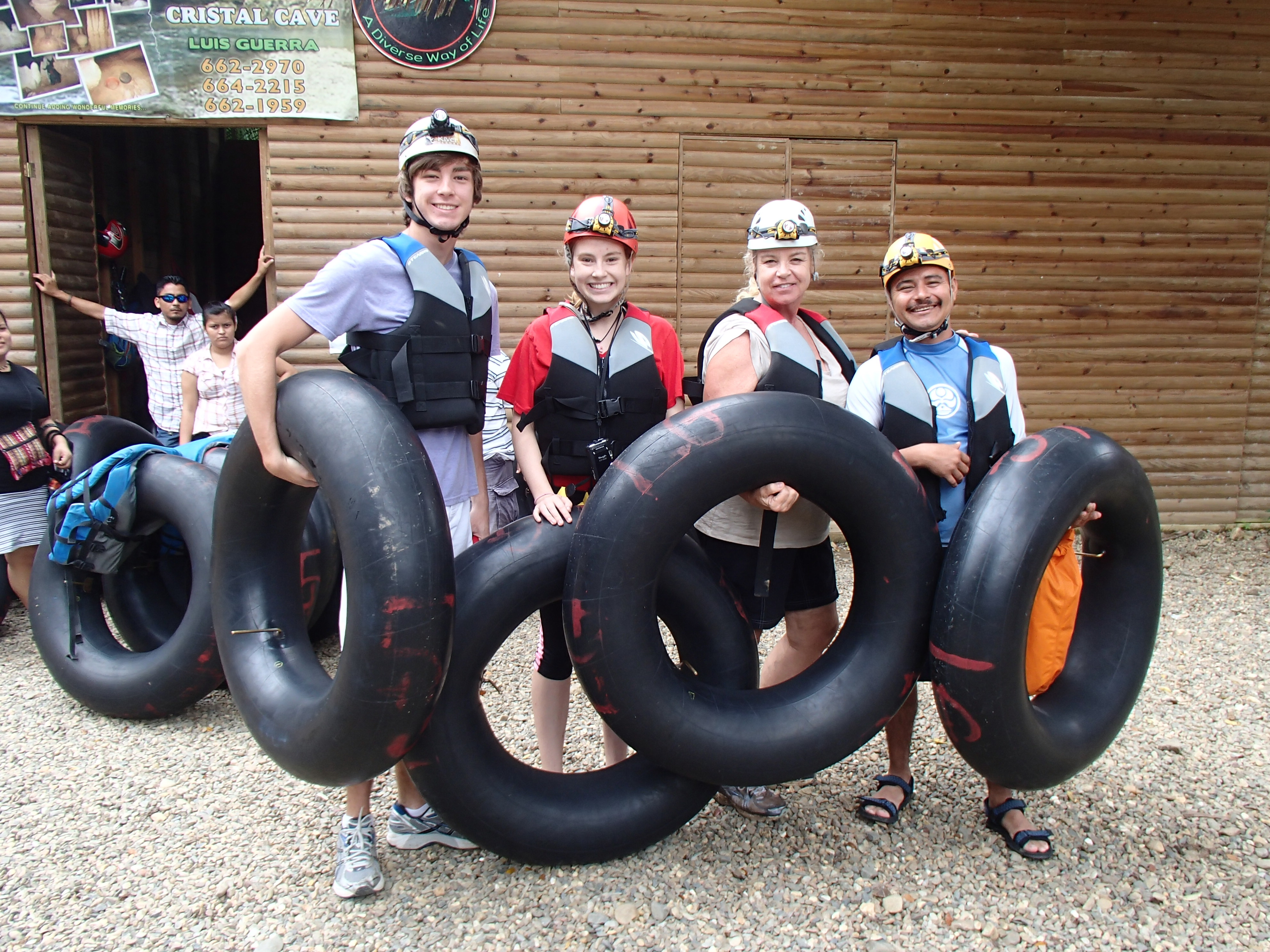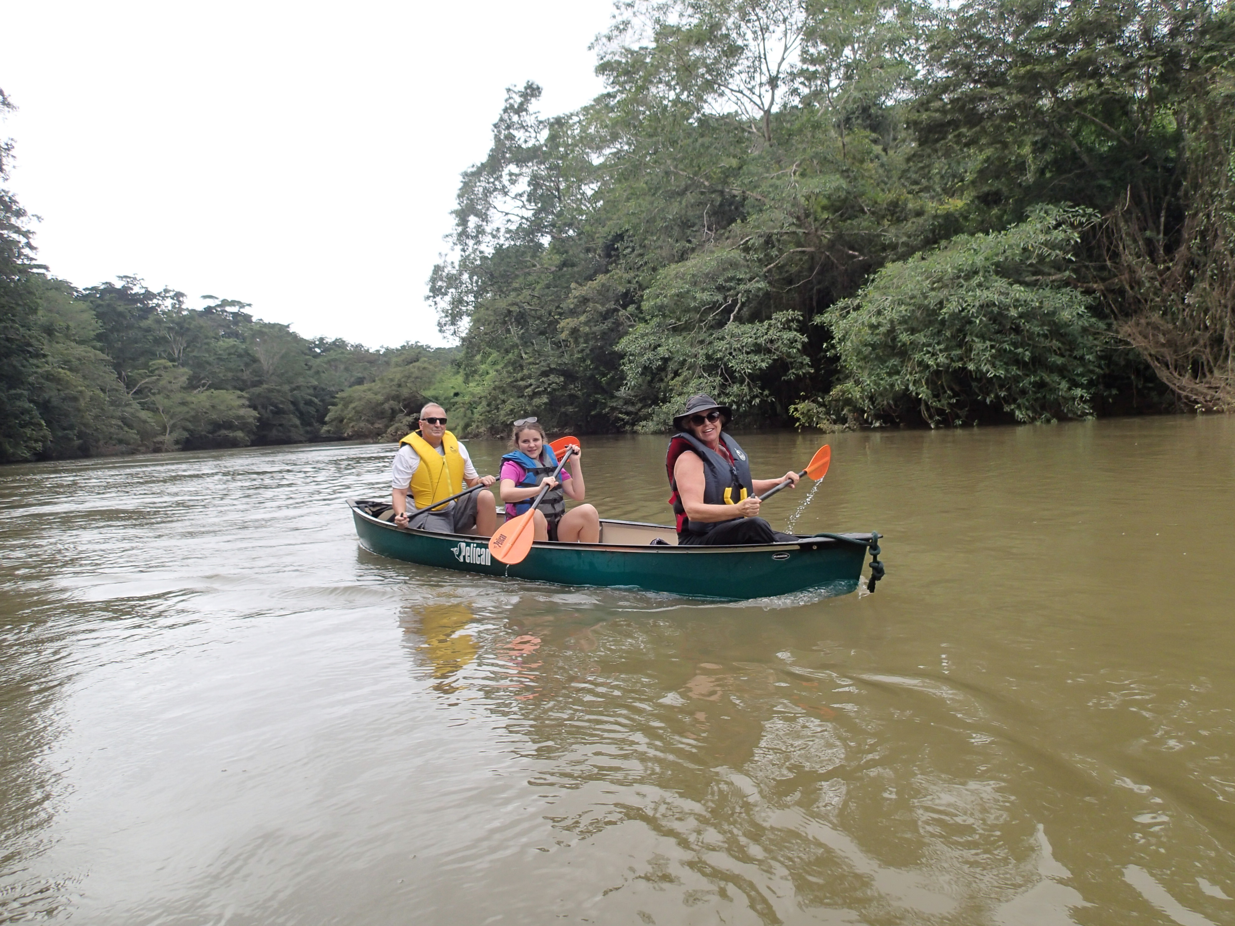 Drinking fresh well water A glass of water from their own well! Imagine being able to drink water from the faucet! Cold and very good! Our first day we were taken to up and over the mountain to one of the many caves and we repelled into the cave. This is NOT So much fun!a tourist destination it is a place the locals found. The cave was massive. Eber our guide for our stay was amazing and always had the answer to your question. Then we went to a place where we could swim with waterfalls all around us. We only saw two people briefly all day. They packed a very good picnic lunch for us and we picnicked on a table overlooking the cascading waterfalls.  Back to our luxury cabin for a hot shower and dinner. Always fun to see who has arrived in the resort. With only 8 cabins you get to meet people from all over the world. The next day we went zip lining at Calico Jacks. We have zip lined all over the world and this one was a lot of fun. Then we went horseback riding on the well cared for horses that eat green grass every day. They were very spoiled and the horses were perfect for young to old riders. While the kids were out for the morningOLYMPUS DIGITAL CAMERA I had a massage and listening to the sounds of the chickens, goats, and birds was a real treat. We did a lot here and had so much fun. Tom and Nadege would come around each evening and make sure that we had lunch ordered if we were going to be away for the day or to tell us who our private guide was. We just wish we had signed up for 6 days and not 4. We loved being on the river in canoes and then the next day we went in tubes down the river. If you are a bird watcher you better not rush your OLYMPUS DIGITAL CAMERAbreakfast because while you eat the toucan’s eat fresh fruit laid out on large platforms in between the trees. So much fun! The fresh eggs were so good and the homemade banana bread was a daily treat. If you are lucky enough to get one of the 8 rooms make sure that you have enough time to do it all or… not at all. You will have privacy if you want or you can meet new friends. We did extensive research and when we were at Mystic River we were very very happy that we were here. Come with a sense of wonder and leave with a sense of Awe. At night you can sleep deeply because of the fresh air and forest silence. Come to renew yourself or bring you closer to your family. Whatever your reason you will be glad you were able to experience Mystic River.