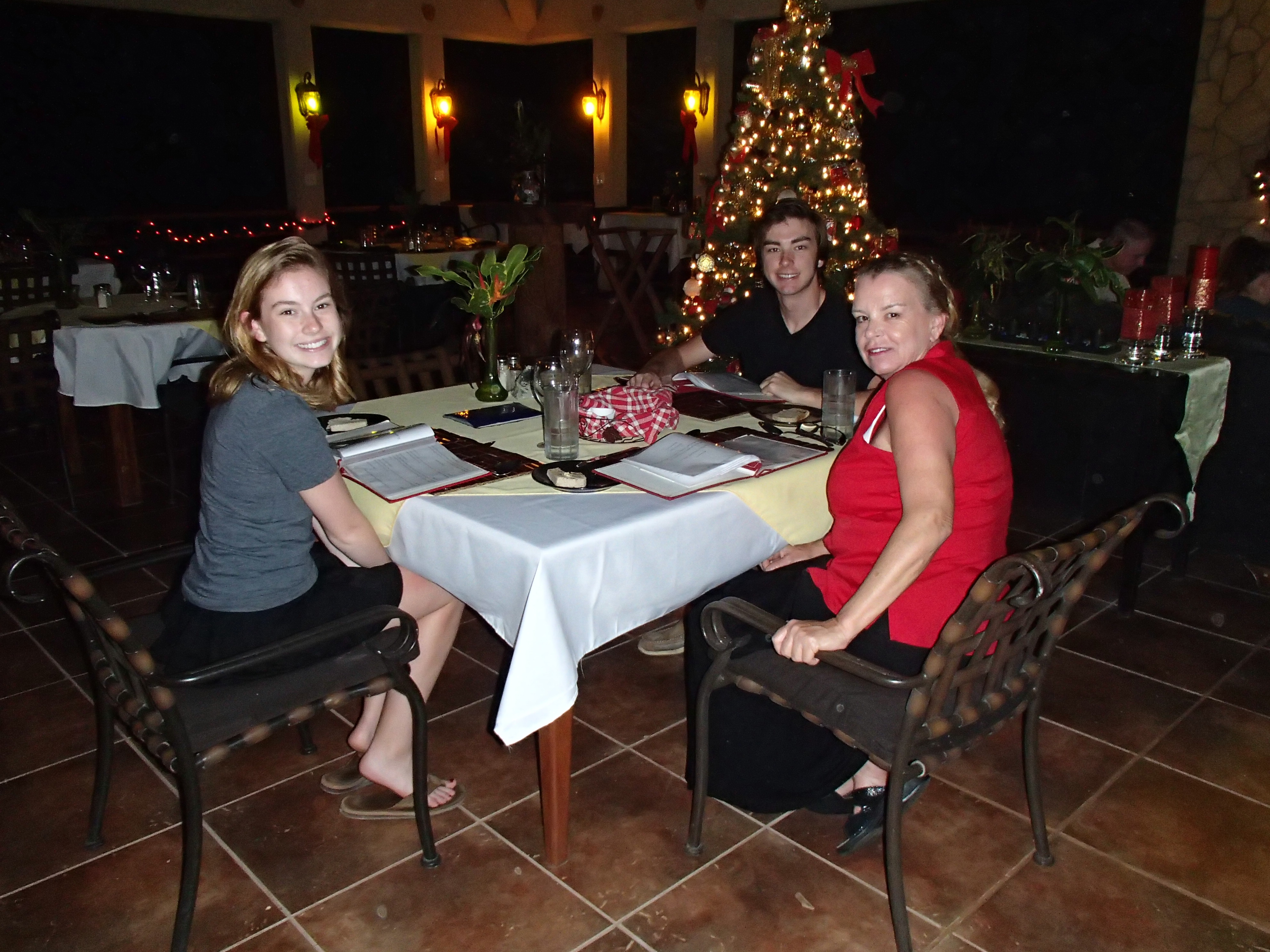 Tom & Nadge the owners When you arrive in a foreign country it is so nice to see your name on a card held by the person that will take you to your destination. Just so happens the owner, Nadege picks you up and you can ask all the questions you want. Mystic River is a place for the person that wants to read by the river and listen to the sounds of the birds or the person that wants adventure. I wanted both. So much to do I felt that View from the dinning room I was at a luxury adventure camp. We arrived late in the day and our arrival was the beginning of an adventure. This is not a paved road street sign destination. It is exciting and it is bumpy. But it was wonderful. Why I felt like it was truly out in the middle of nowhere. I had no intention of leaving the resort except for my daily adventures. This is why you come here. Not to run to town but to relax and enjoy this very quiet out of the way riverside resort. When you come around the bend and proceed up the hill and arrive into this beautiful resort you wished you were staying longer. Out luggage disappeared and I am glad there was no way I would be dragging it on the pebble walkway.  We went to the Palapa Bar for a late lunch. Our adventure package included a meal plan and after our stay here this is the ONLY way to go. We ordered from the extensive menu and each and every meal was gourmet fresh and wonderful. We were shown our huge room with a deck to sit on to watch the birds on the river. Very nice and big for a family to call home. Mystic River is a place for adventure and I wanted to be with my adult kids and have fun. This place is perfect for the older teen that loves the outdoors. Our first night’s dinner was so good that I was glad that I was going to be active. Thank you to the kitchen staff at Mystic River. Here we are in the jungle of Belize and I am handed a glass of water!